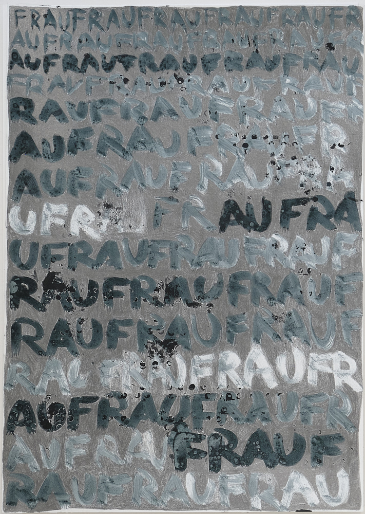 Im fortlaufenden Schreibprozess kommt es zu Überträgen und Verschiebungen zwischen den Zeilen: Das Wort endet und beginnt nicht konsequent am Zeilenrand, sondern setzt sich fragmentiert in der folgenden Zeile fort („FRAUFR“ / „AUFRAUFRAU“ / FRAUFRAUFRAU“). Subtil erzeugt die Künstlerin eine Störung der Silben. Buchstaben und Laut- reste überlagern sich und destabilisieren die visuelle und semantische Einheit des Begriffs. Das Wort FRAU erscheint dadurch weniger als Träger einer fixierbaren Bedeutung, denn als serielle Spur eines Signifikanten, der sich seiner eigenen Lesbarkeit entzieht. Weiblichkeit wird hier nicht als positive Identität, sondern als imaginäre und symbolische Konstruktion innerhalb einer männlich codierten Ordnung begriffen.