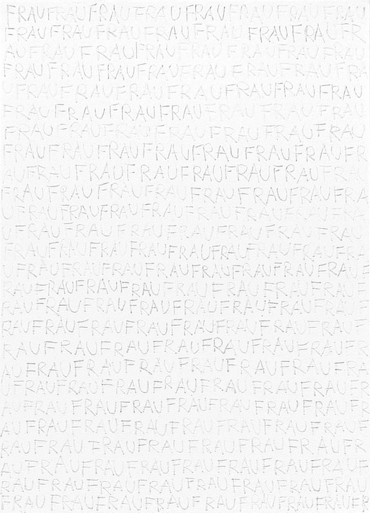 Diese Auflösung findet sich auch in der ersten Arbeit in Bleistift auf Papier, dort wird durch den abschließenden Akt des Radierens, also bewusst partiellen Entfernens der Schrift, eine weitere Verschärfung erreicht. Die gesamte Schriftfläche wird gelöscht, ohne vollständig zu verschwinden. Aufgrund des harten Bleistifts bleibt das Schriftbild als feine Prägung und Graphitspur im Papier lesbar, gleichsam in die Oberfläche geritzt. Die Buchstaben erscheinen abgeschwächt, wie eingegraben und implizieren somit eine doppelte Zeitlichkeit des Entstehungsprozesses: den ursprünglichen Schreibgestus und dessen nachträgliche Tilgung. Die Spuren des Wortes FRAU verweisen auf die Unaufhebbarkeit symbolischer Einschreibung: Sprache lässt sich nicht rückgängig machen, sondern nur verschieben, beschädigen, entstellen. In diesem Sinne bestätigen Schmidts Arbeiten eine zentrale Einsicht poststrukturalistischer feministischer Theorie: Eine feministische Sprache über Weiblichkeit kann nicht auf Sinnstiftung zielen, sondern muss die Bedingungen von Sinn selbst problematisieren.