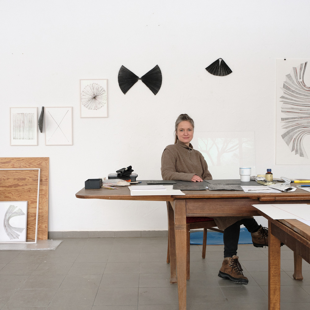 In ihrer Serie Gitter arbeitet Juliane Schmidt mit rund zwanzig Graphitstiften verschiedener Gradation, variiert Druckintensität und Minenschärfe. Ihre freihändig gezogenen, sich kreuzenden Geraden folgen keinem optischen Befund, sondern lassen Kräfte innerer Strukturen spürbar werden. Jede Linie wächst als Spur eines sich bewegenden Punktes und wird so zum Speichermedium für Dynamik, Richtung, Spannung und Zeit ihrer Zeichnerin.